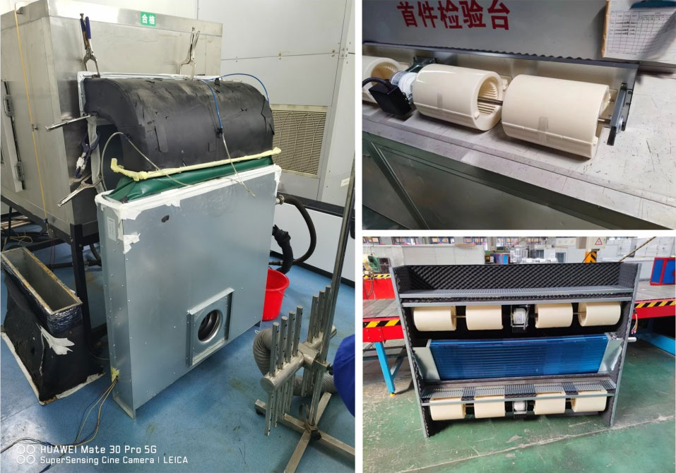 在疫情防控的关键期,市面上相继推出净化型风机盘管机组,但是这类机组的过滤网都是装在进风口的,回风箱里是负压状态,如果密封不好送风净化效率将大受影响。针对这一弊端,团队人员对现有风机盘管机组进行技术改进,经过反复测算,调整测试,确定将过滤网放置于风机表冷器之间的正压区,这样就保证了送到风口的风都是净化过滤后的,净化效率大大提升。