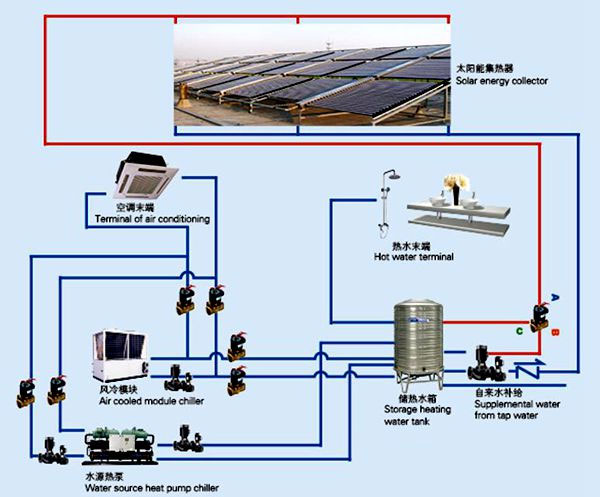 该系统有冬夏两种运行模式,在夏天模式需要制冷时,风冷模块切换到制冷模式独立运行,满足建筑的制冷需求;太阳能系统的集热器加热储热水箱中水,可以全天24小时满足建筑中的洗浴生活热水需求。
