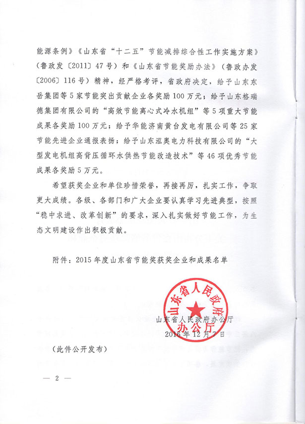 12月12日,山东省经济和信息化委员会网站公布了鲁政发字【2016】217号,山东省人民政府办公厅关于公布山东省节能奖获奖企业和成果名单的通报。