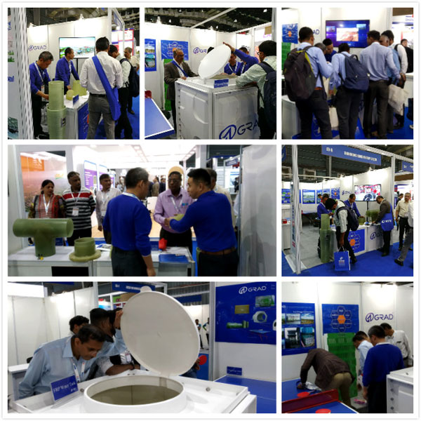 此次展会展出的产品主要有:SMC水箱、缠绕管道、玻璃钢格栅、井盖、拉挤型材、SMC乒乓球台。SMC水箱因其质量轻、耐腐蚀、无毒性的特点引来大量客户驻足观看;玻璃钢缠绕产品的展出吸引了许多印度当地缠绕产品厂家上门进行技术沟通与交流。