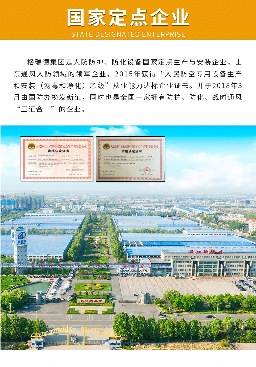 格瑞德1993年建立于山东德州,目前是一家围绕人工环境,横跨新能源、新材料、装备制造、节能环保、信息技术五大战略新型产业的企业集团。格瑞德进行全球化业务运作,产品和服务遍布全国的每一个省市和全球五大洲的100多个国家和地区,广泛应用于基建工程、商业地产、工业制造、农业开发、电子信息、车辆工程、环保处理、医药净化、海洋工程、轨道交通等领域。格瑞德从业人员过万人,在山东、贵州、四川、新疆、内蒙等地建有生产基地,在上海、北京、济南、兰州以及美国洛杉矶建有研发中心。